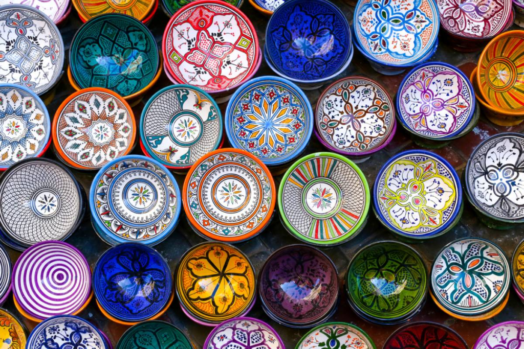 - Cerámica y alfarería: Un arte muy arraigado en la cultura marroquí. La cerámica de Fez se distingue por su característico color azul y sus elaborados diseños geométricos. En Safi, la cerámica es conocida por su mayor variedad de colores. El zellige, un tipo de mosaico de cerámica, es una de las expresiones más altas de este arte, decorando palacios y mezquitas.