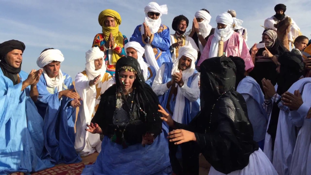 - Guedra: Es una danza ritual de las tribus del Sahara, donde una mujer arrodillada y cubierta con un velo azul o negro realiza movimientos gráciles de las manos y el cabello, al ritmo de una percusión constante. Su objetivo es inducir un estado de trance y bendición.